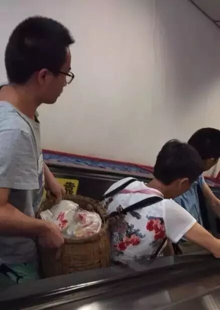 地铁站,一个男生见前面的老奶奶背的筐子很重,便悄悄在后面为她托着。
