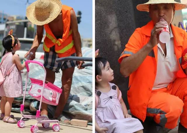 西安高新区,烈日炎炎中一个小女孩儿在妈妈的陪伴下给环卫工人送冰水。因为太热她的脸都晒红了。