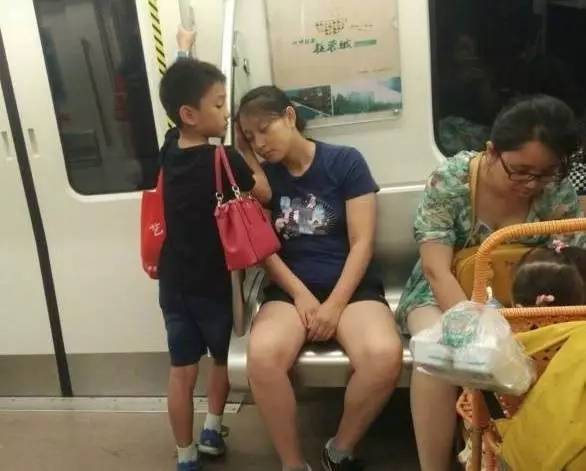 地铁上,小男孩主动把位置让给给带小宝宝的阿姨,在妈妈休息时,暖心地用手为妈妈垫着头,还帮妈妈背着包。
