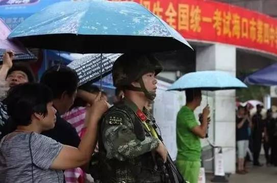 高考日突降大雨,在外面等候考生的家长为站岗的武警战士撑伞。阿姨说:“这个武警战士看起来和我孩子差不多大,我实在是不忍心看着他淋着雨执勤。”