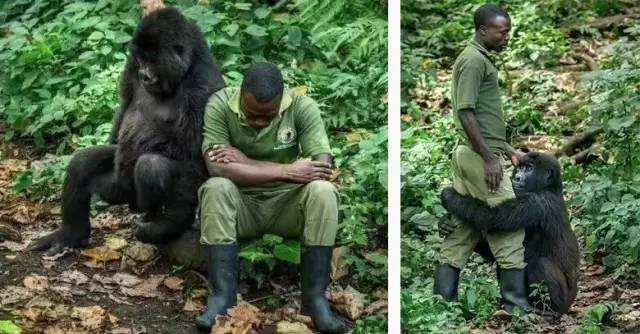 满面愁容的护林员坐在树干上发呆,这时一只猩猩走过来,紧紧地抱住了他,好像在说:“没事的,还有我。”