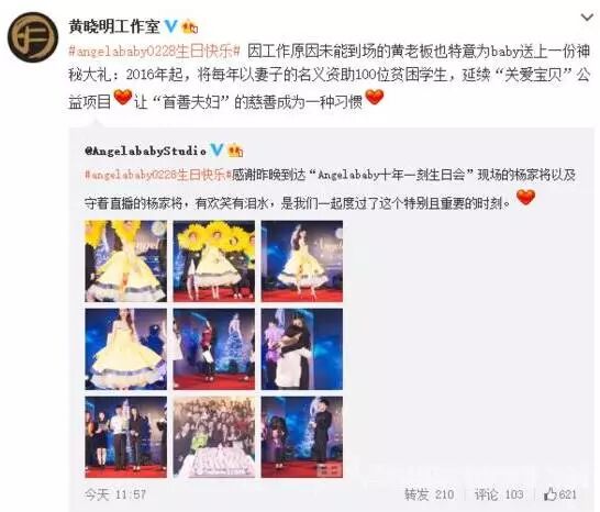 除了这些礼物之外,还以Baby的名义做公益,延续这一份爱,如去年baby生日,黄晓明就表示每年会以baby生日为名义,每年资助100个贫困儿童,这份用心实属难得。