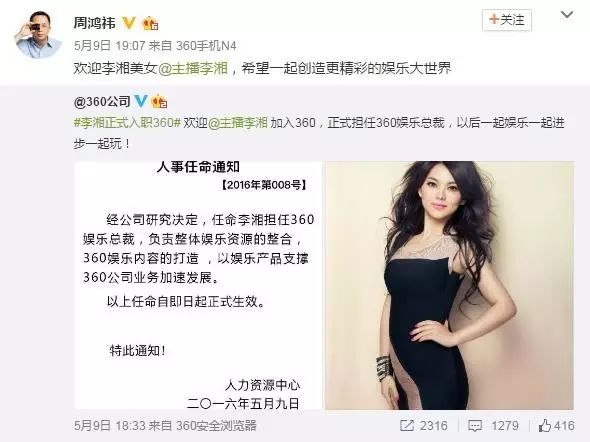 5月9日,周鸿祎在微博正式宣布知名主持人李湘入职奇虎360。