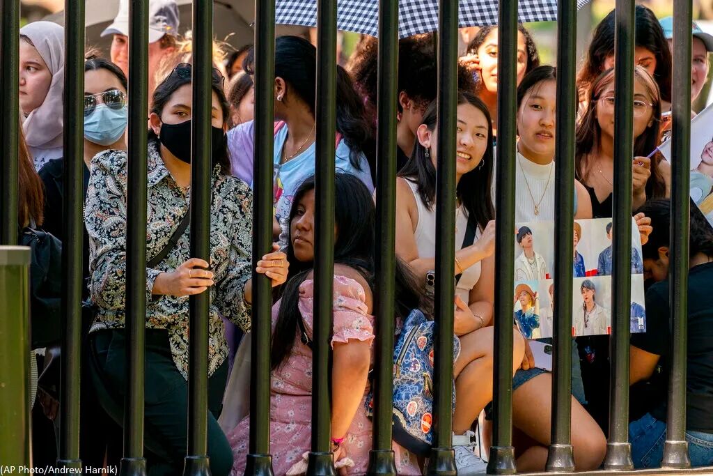 2022年5月31日星期二,韩国流行乐超级组合BTS在华盛顿访问白宫,粉丝们站在宾夕法尼亚大道上北草坪的大门口。(美联社照片/Andrew Harnik)