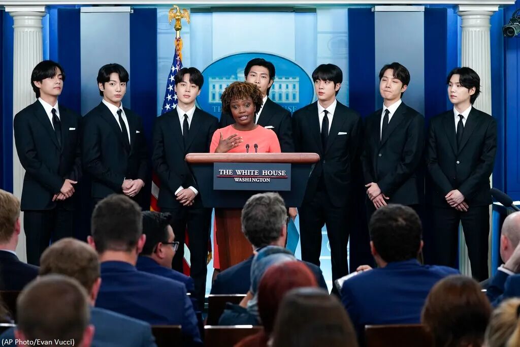 On May 31, 2022, members of the K-pop supergroup BTS joined White House press secretary Karine Jean-Pierre during the daily briefing at the White House.