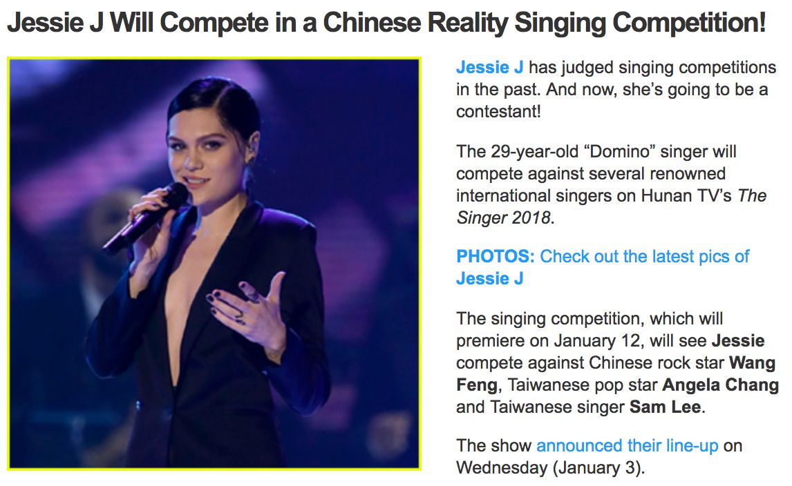 “Jessie J要参加中国真正的唱歌比赛去了!”