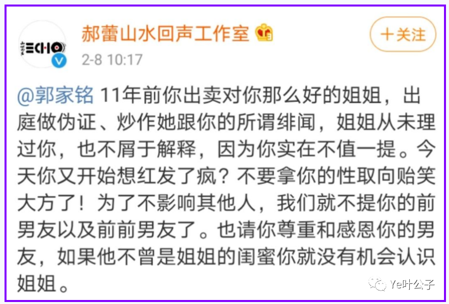 11年前,你出卖对你那么好的姐姐,还出庭作伪证、炒作和她的绯闻,姐姐从未理过你。结果你现在又出来折腾!不要拿你的性取向贻笑大方了!为了不影响别人,我们就不提你的前男友和前前男友了,也请你尊重你的现男友,如果不是他,你压根没有认识姐姐的机会。