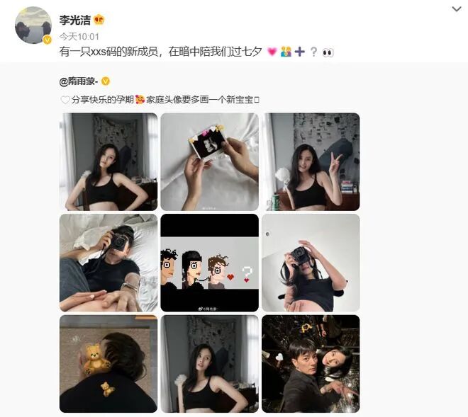 李光洁官宣妻子怀二胎! 音乐有话说 内地男星 2023-08-23 14:09:32 335 创作不易,用心坚持,欢迎请BaGua喝几杯爱心咖啡!打赏并支持本文 打赏并删除本文 8月22日恰逢七夕,在这个特殊的日子,不少人都开启了秀恩爱模式。当天,演员李光洁在官宣老婆隋雨蒙怀二胎的喜讯↓↓↓此前,隋雨蒙已经先老公一步公开了数张大肚照,再度升级准妈妈的她满心喜悦地写道:“分享快乐的孕期,家庭头像要多一个新宝宝”。随后,李光洁转发妻子动态并激动发文:“有一只xxs码的新成员,在暗中陪我们过七夕”。照片中,李光洁伸手抚摸妻子的肚子,二人双视角互拍,幸福不已。李光洁与隋雨蒙2019年7月3日官宣结婚。2020年5月,李光洁怀抱婴儿,一家三口现身机场。公开资料显示,李光洁1981年4月23日出生于河南省平顶山市,中国内地男演员、导演。2001年,主演近代剧《走向共和》正式出道。主要作品有《军人机密》《大清风云》《立春》《流浪地球》《风吹半夏》《县委大院》《万里国境》《杜拉拉升职记》等。2012年,李光洁凭借首次执导的微电影《幸福速递》获得年度“触电”竞赛单元最佳剧情短片奖 ;同年,凭借爱情片《山楂树之恋》获得第二届乐视影视盛典“电视剧飞跃进步演员”奖 。2015年5月20日,凭借话剧《罗密欧与朱丽叶》获得壹戏剧大赏“年度最佳男演员”奖。隋雨蒙1991年出生于哈尔滨,曾在《欢乐颂》中饰演关雎尔的同事兼闺蜜米雪儿,《琅琊榜》中饰演宁国侯府的大小姐谢绮。来源:极目新闻、李光洁、隋雨蒙微博、公开资料编辑发布:音乐有话说转载请注明出处好看的人都在星标 ?受微信公众号改版影响,如果不对你常看的公众号星标的话有可能会看不到小编们精心挑选的封面大图,以及不能在第一时间收到【音乐有话说】的精彩活动、娱乐新闻、新歌推荐、福利信息等推送内容!为了不错过这些,请一定要星标!推荐阅读1、巡演还没结束,他的演唱会完整版已被疯传!2、冲上热搜!“身体欠佳”,那英缺席3、胡歌深夜发声冲上热搜,粉丝炸锅了!文中图片来源于网络,版权归原作者所有如有侵权,请及时联系删除恭喜,下方 分享 点赞 在看 三连击? 创作不易,用心坚持,欢迎请BaGua喝几杯爱心咖啡!打赏并支持本文 打赏并删除本文 感谢您的支持鼓励,我会继续努力的!文章地址:用户邮箱:打赏金额:USDT 请输入数字点击”去打赏“,即可进行打赏支持本文章哦 李光洁 发表评论