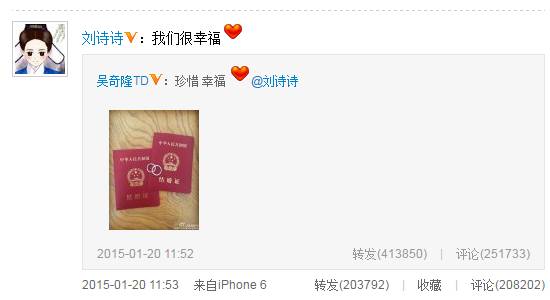 2015年01月20日,吴奇隆在微博晒出两张结婚证以及一对钻戒,并圈出刘诗诗,并感言“珍惜,幸福”。几分钟后,刘诗诗转发这条微博,并发幸福宣言:我们很幸福。