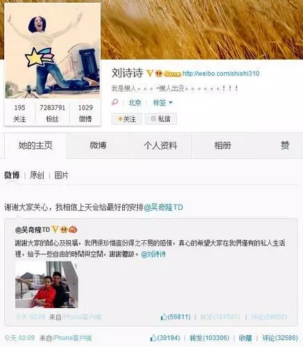 吴奇隆在2013年11月13日凌晨公布恋情,发微博向刘诗诗表白,刘诗诗也很快回应。