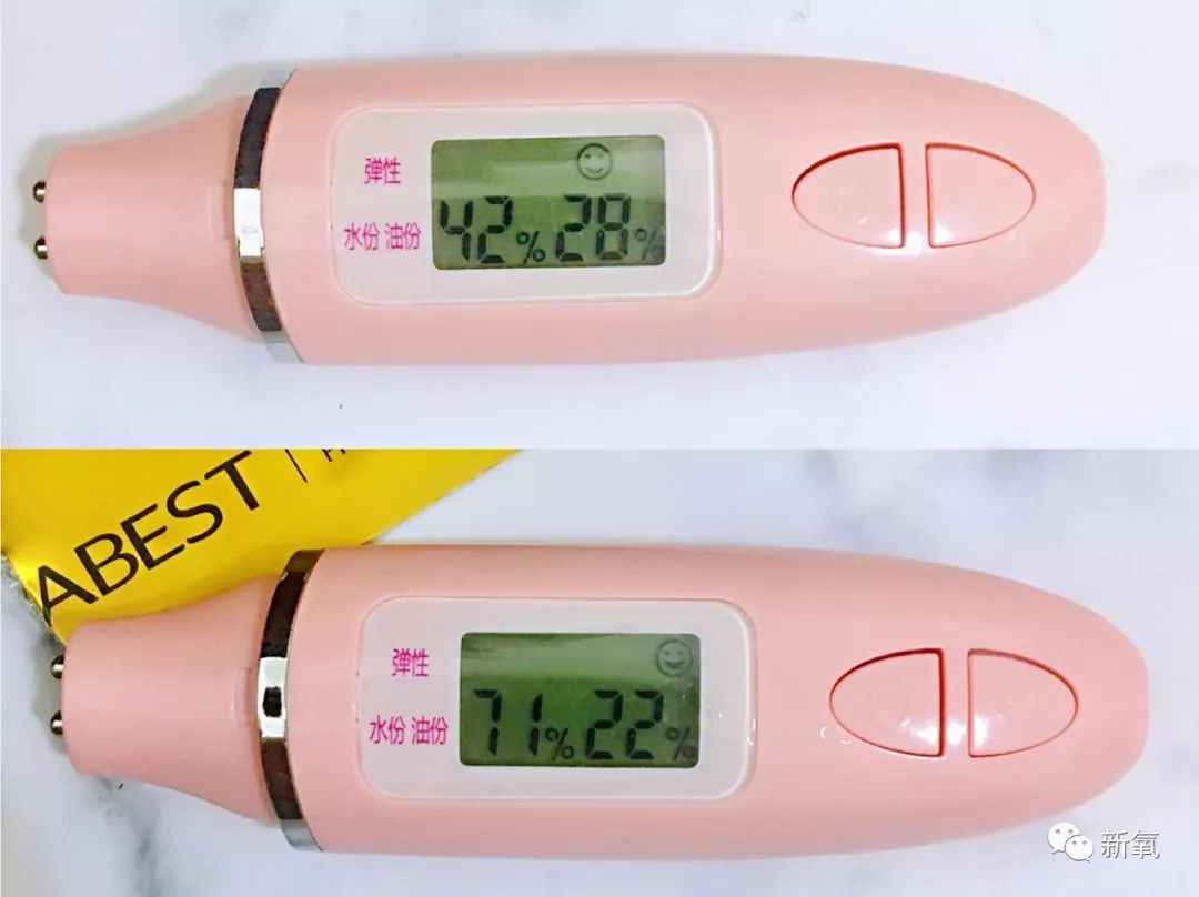 敷完之后能明显感觉到皮肤像喝饱了水的水润感,皮肤变得非常柔嫩顺滑。为了给大家看直观的看一下补水效果,迷死氧还是记录了下敷前敷后的水油比。敷面膜之前,水分含量只有42%,之后高达71%。弹性也明显变好。