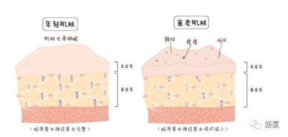 同时胶原蛋白流失,肌肤弹性减弱,紧致度饱满度都会下降。出现凹陷(皱纹)、下垂等问题。