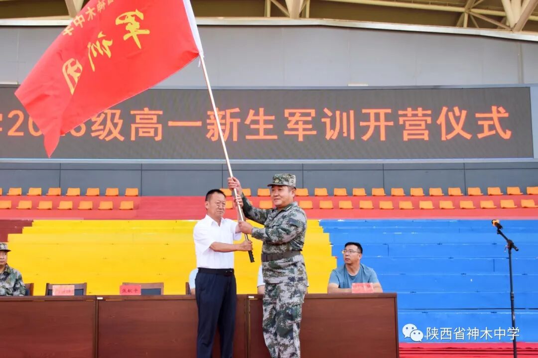 焦献平校长向军训团团长高梓淳授军训团团旗,并宣布2023级高一新生军训正式开营。