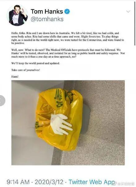 汤姆·汉克斯发推文说,“我和丽塔来澳大利亚了。我们感到有点累,好像得了感冒和一些身体疼痛。丽塔有些反反复复的寒意,也有些轻微发烧。我们已经进行了冠状病毒检测,结果是阳性的。”