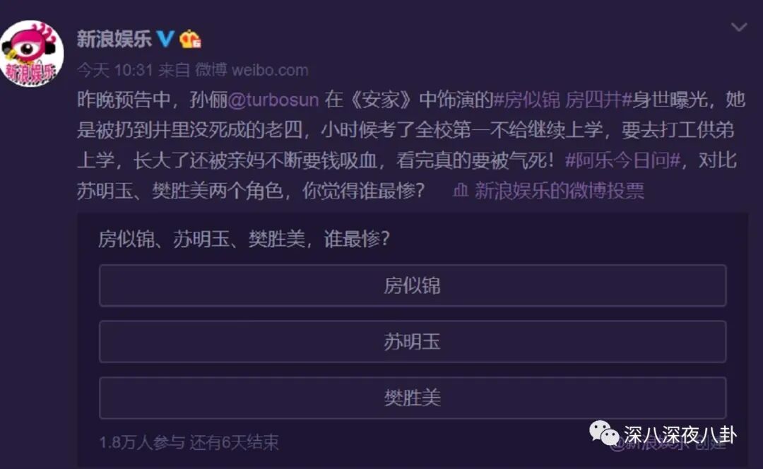 虽然说《安家》收视牛逼,但是引起话题的仍然是原生家庭对一个人的影响有多大……这个话题真的是从樊胜美后就一直有,去年是苏明玉,今年轮到房似锦。网上直接问,这三个人谁最惨!
