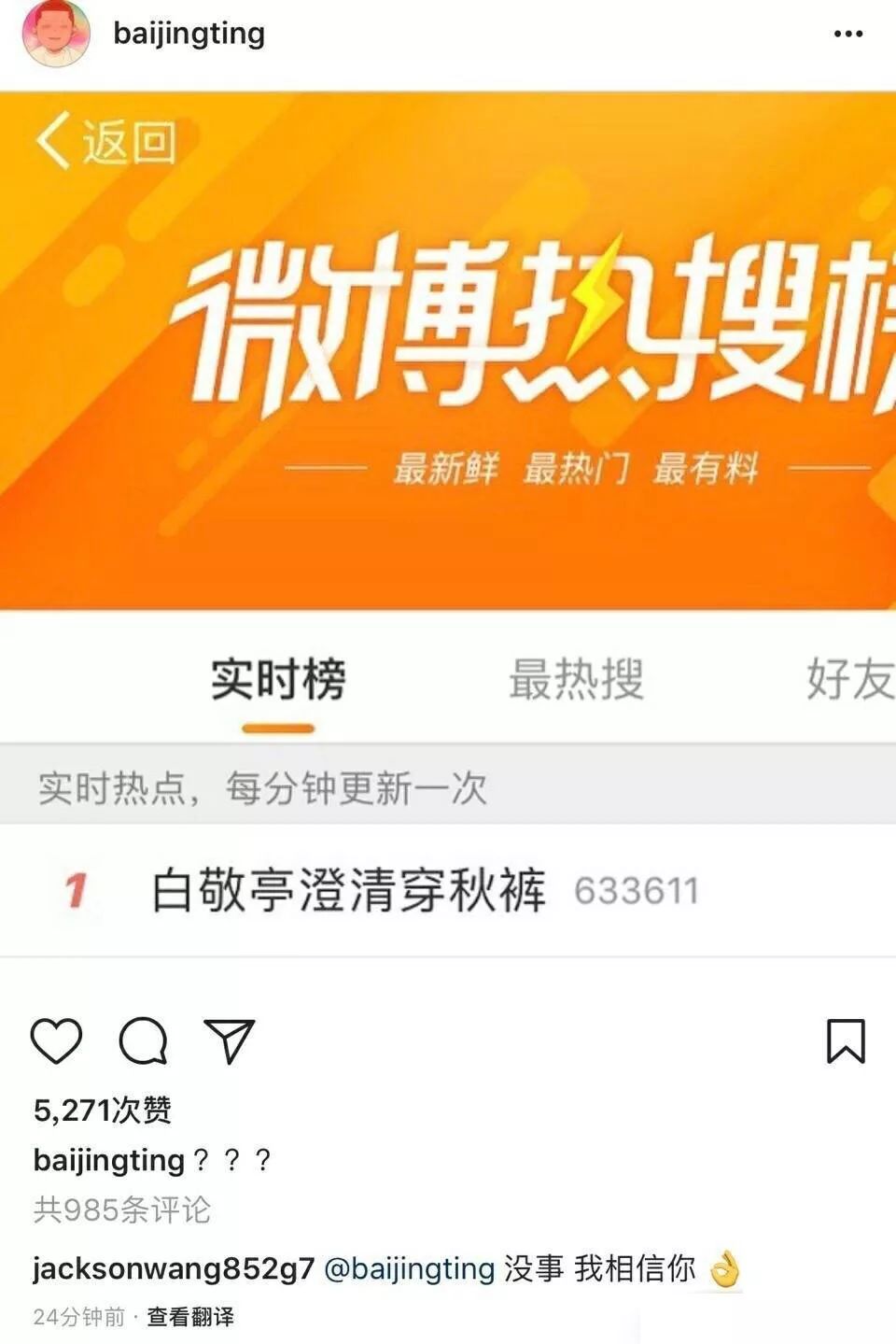 最近的“秋裤事件”想必你们有所耳闻了,白敬亭一连上了两次热搜,还赶紧在ins上表示了委屈:“那真是我的腿”,评论区却出现了“秋裤好兄弟”王嘉尔的评论:没事,我相信你。