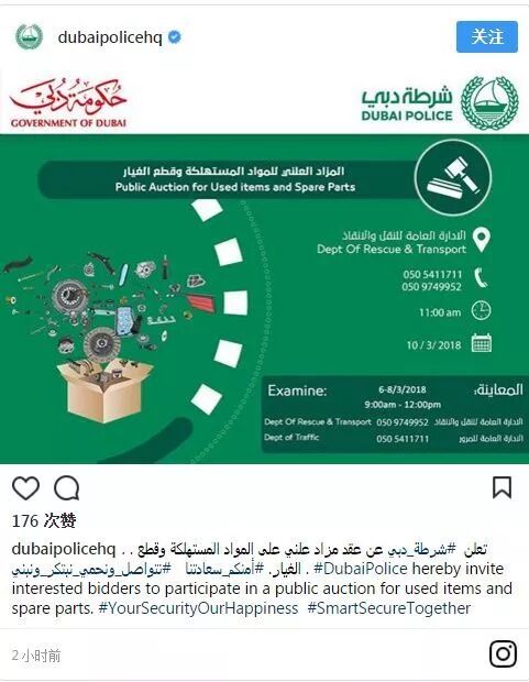 迪拜警方今天宣布,将于下周在离国际城最近的运输和救援部门举行本年度第一次公开拍卖会,以便居民购买自己暂缺的车辆配件。
