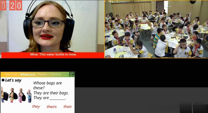 ③双师课堂中“双师”配合默契。我们可以看到中教老师“Ms.He”非常配合Ciara老师的课堂,仿佛是Ciara的“手”和“脚”,Ms.He能够及时的给孩子们解释课堂活动的规则和他们听不懂的句子,鼓励学生作答,有效的管理了课堂纪律,这也是双师教学优于单纯的线上教学模式的一点。