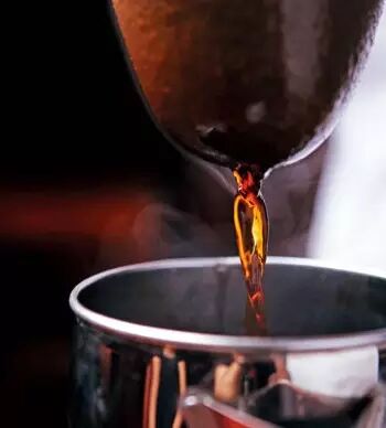 评价一杯奶茶是否好喝,最重要的一个标志就是看它是否够香滑,这跟撞奶的手法有直接关系。冲得很成功的一壶茶底,先不加奶,放在不锈钢壶里保温,而且要在一个小时之内用掉。最后出品之前的点睛工序就是撞奶,要客人随点随做,还可以根据客人的喜好控制加奶的量。