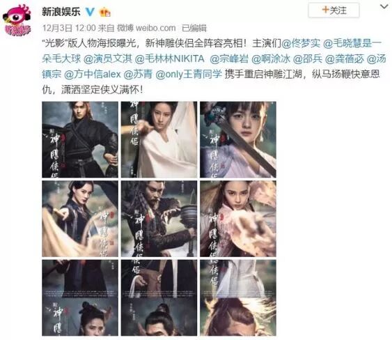成全了陈晓和陈妍希的新版《神雕侠侣》,又有了最新版《神雕》,佟梦实饰杨过,毛晓慧演小龙女,文淇版的郭襄,单从定妆照看,这妆容有点用力过猛。