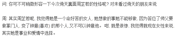 查资料时看到当年在香港宣传时,媒体让她形容一下周芷若这个角色,她动情的说:“觉得那是一个很命苦的角色,想做的事不能做,因为答应了师傅要做掌门人。”二十多年后,她真成了“掌门人”,也算一种成全吧。