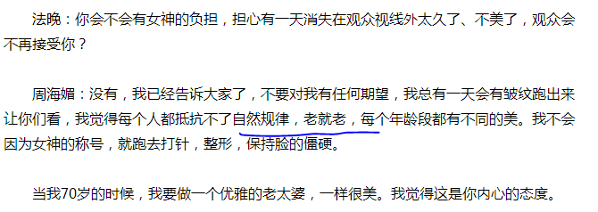 在演艺圈闯荡三十多年的老演员们身上都多了一份淡然,多了一颗平常心。得意时不骄不躁,失意时不自怨自艾。周海媚曾说:我已经告诉大家,不要对我有任何期望,我总有一天会有皱纹跑出来,每个人都抵抗不了自然规律,老就老,每个年龄段都有不同的美,当我70岁的时候,我要做一个优雅的老太婆,一样很美。