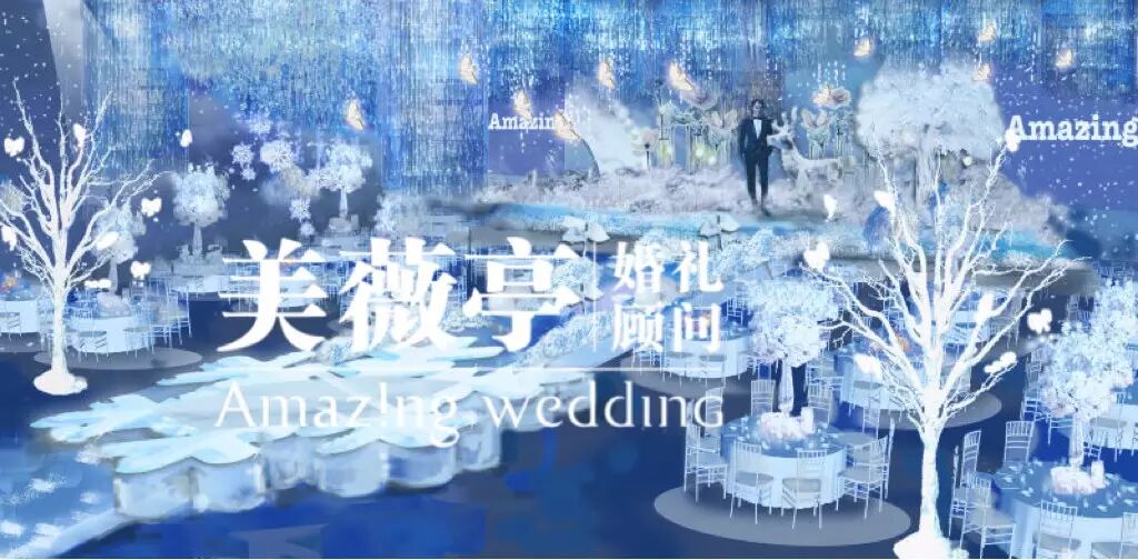 婚礼的主题是“洁白如冰雪,鸟语也花香”,他们渴望生活在一片冰蓝色的世外桃源,那里有硕大的花,有清澈如眼眸的水,有悠闲自在的鹿,还有成群的鸟儿在自由的吟唱。于是,设计师就用手绘图的方式,将这充满爱的概念具象在了眼前。