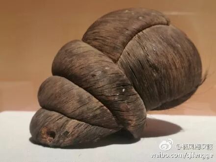 ↑ 1972年新疆吐鲁番如阿斯塔纳村古墓群出土木俑头部有各种式样的假发髻,发丝精细匀称。 此发髻是以麻布为衬里,把棕毛缠绕在麻布上,制成一个造型,再经过染色处理制作而成。