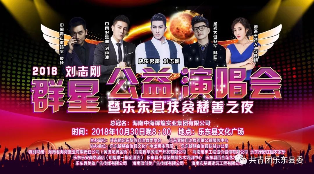 本场演唱会是由刘志刚领衔岀演并携手国内及国际著名歌手等联合打造的首个“2018年刘志刚群星公益演唱会暨乐东县扶贫慈善晚会”。由共青团乐东县委、乐东县希望公益服务中心主办,由中共乐东县委宣传部、乐东黎族自治县扶贫办公室、乐东黎族自治县工商联(总商会)、乐东黎族自治县招商办、乐东县文化广电出版体育局协办,本次演唱会诚邀各界爱心人士、各大商家前来观看(本次演唱会不收取任何门票),此次活动获得的善款,将全部用于乐东县扶贫事业。