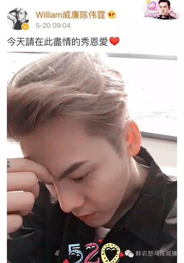当当当!一年一度的520如期而至,又到了情侣们秀恩爱的季节(>O<) !而我们的帅饱饱陈伟霆同学虽然贵为单身狗,但还是一大早就贴心得给粉粉发520自拍