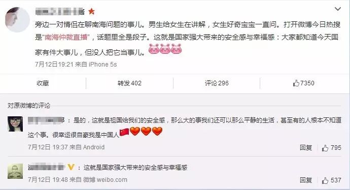 南海仲裁,虽说作为小小的国民的我们,帮不上啥大忙,但我们必须清楚的是,我们的祖国虽疆土辽阔,地大物博,但每一寸土地,和每一滴海水都是容不得外人以强权夺去的。忽然想到了我们哒台湾省,坚决抵制台独势力,台独艺人… 希望在有生之年可以看到祖国的统一…