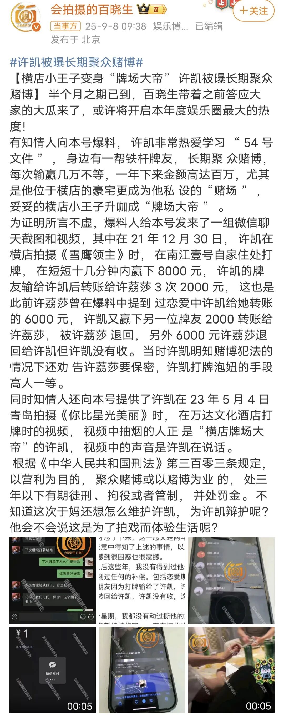 1. 娱乐博主曝猛料:许凯长期聚众赌博,细节“实锤”