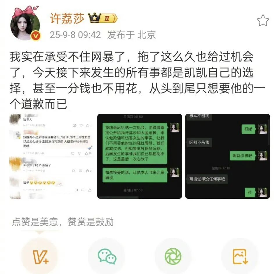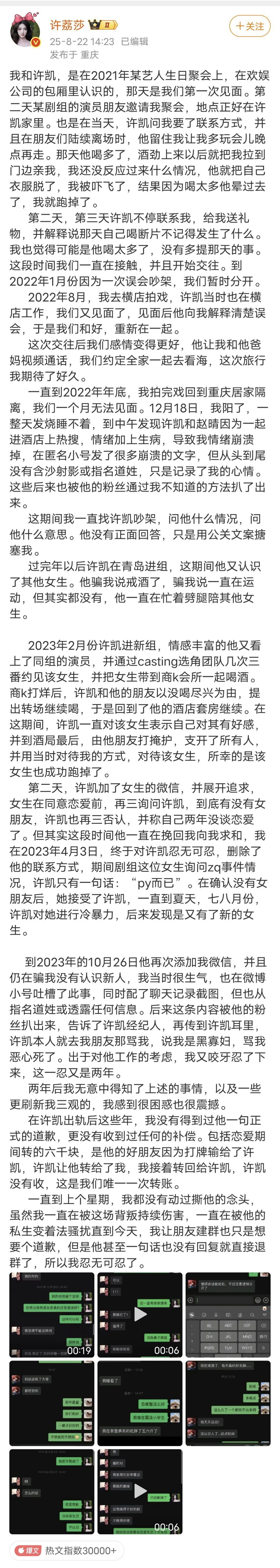 根据娱乐博主“会拍摄的百晓生”爆料图片可知,真正爆料人为许荔莎,且在“会拍摄的百晓生”发文几分钟后,许荔莎发文:“我实在承受不住网暴了,拖了这么久也给过机会了,今天接下来发生的所有事都是凯凯自己的选择。”她声称自己从头到尾只想要许凯的一个道歉而已。