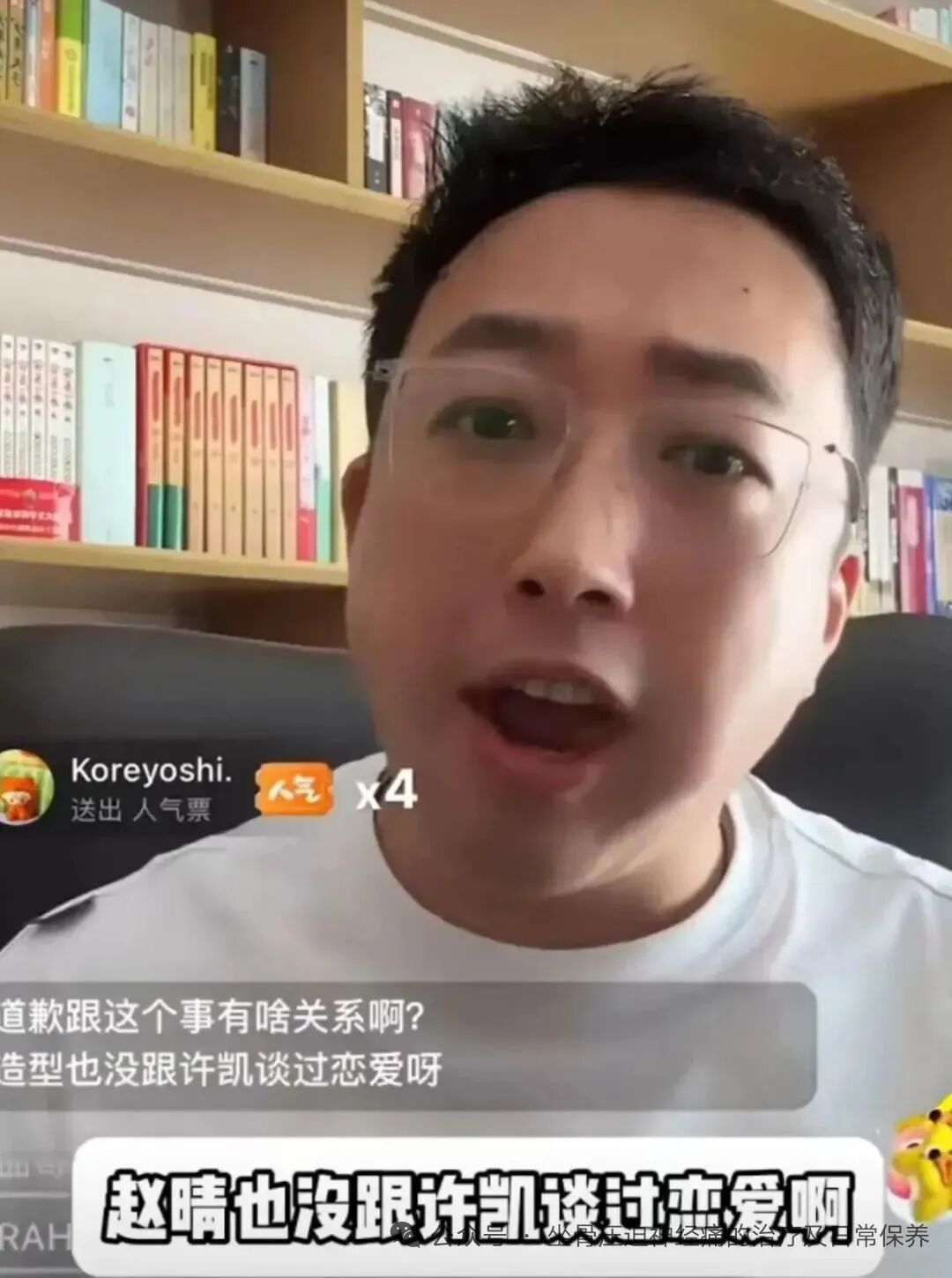 随后惹得于正直播发飙,称许荔莎是私生粉,得不到许凯就要毁掉许凯,并回应许凯与赵晴一同进酒店是因为他要求赵晴为许凯练习台词,两人只是同事。