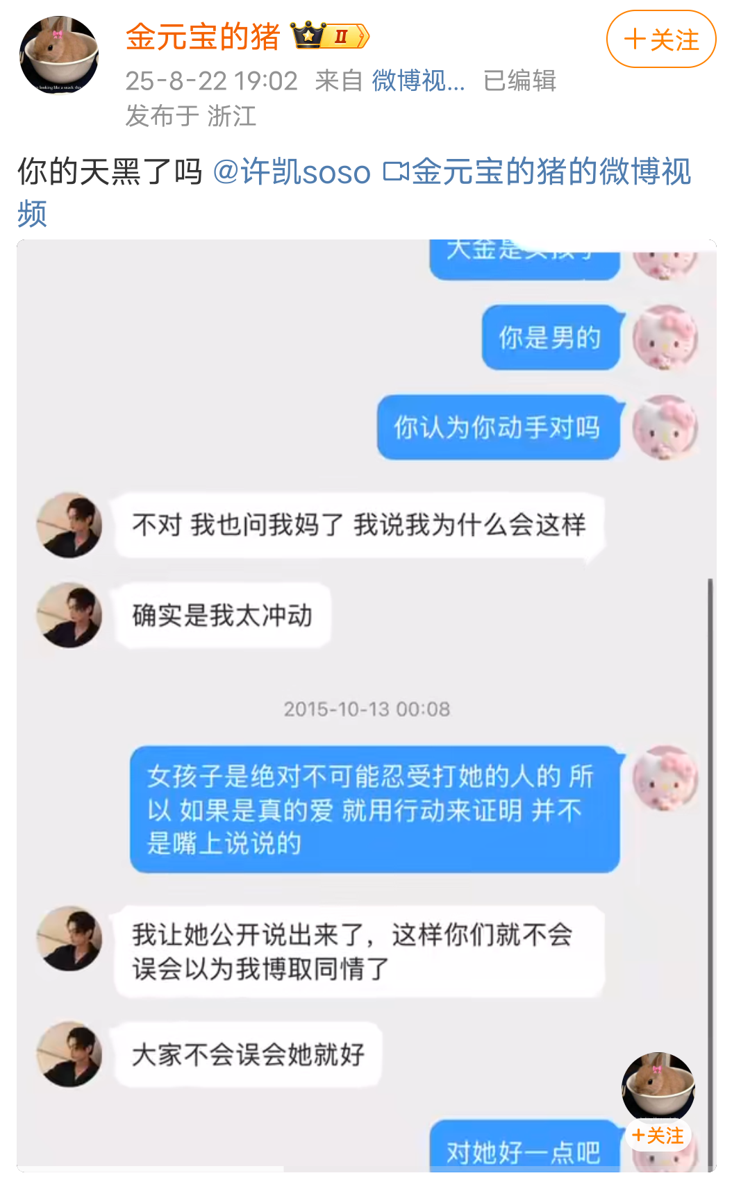 8 月 22 日,大金晒出 2015 年第三人视角的私信录屏,录屏内容显示当时有人私信许凯,劝他好好对待大金,指责他只会嘴上说爱,许凯则回复称自己确实太冲动了,但不会无缘无故动手,侧面承认了自己在冲动之下动手打了女方 。