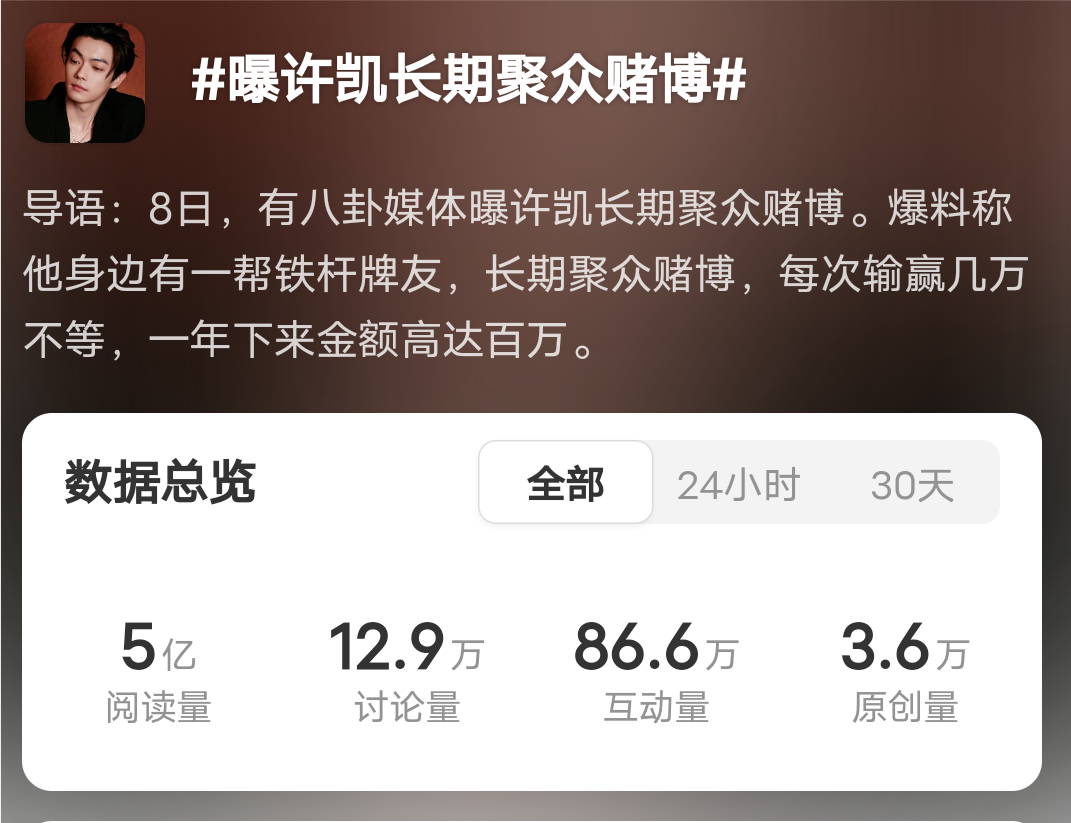 今日,微博热搜榜再度被娱乐圈负面新闻引爆,#曝许凯长期聚众赌博#话题以惊人速度攀升至榜首,截至目前,相关话题阅读量突破5亿,讨论量超12.9万。