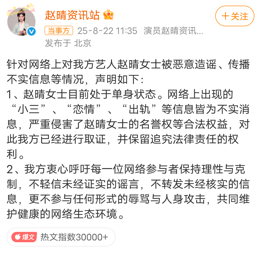 赵晴方否认“恋情”“出轨”等事;于正也在微博发文“事件已交给警方,对造谣者决不姑息”。