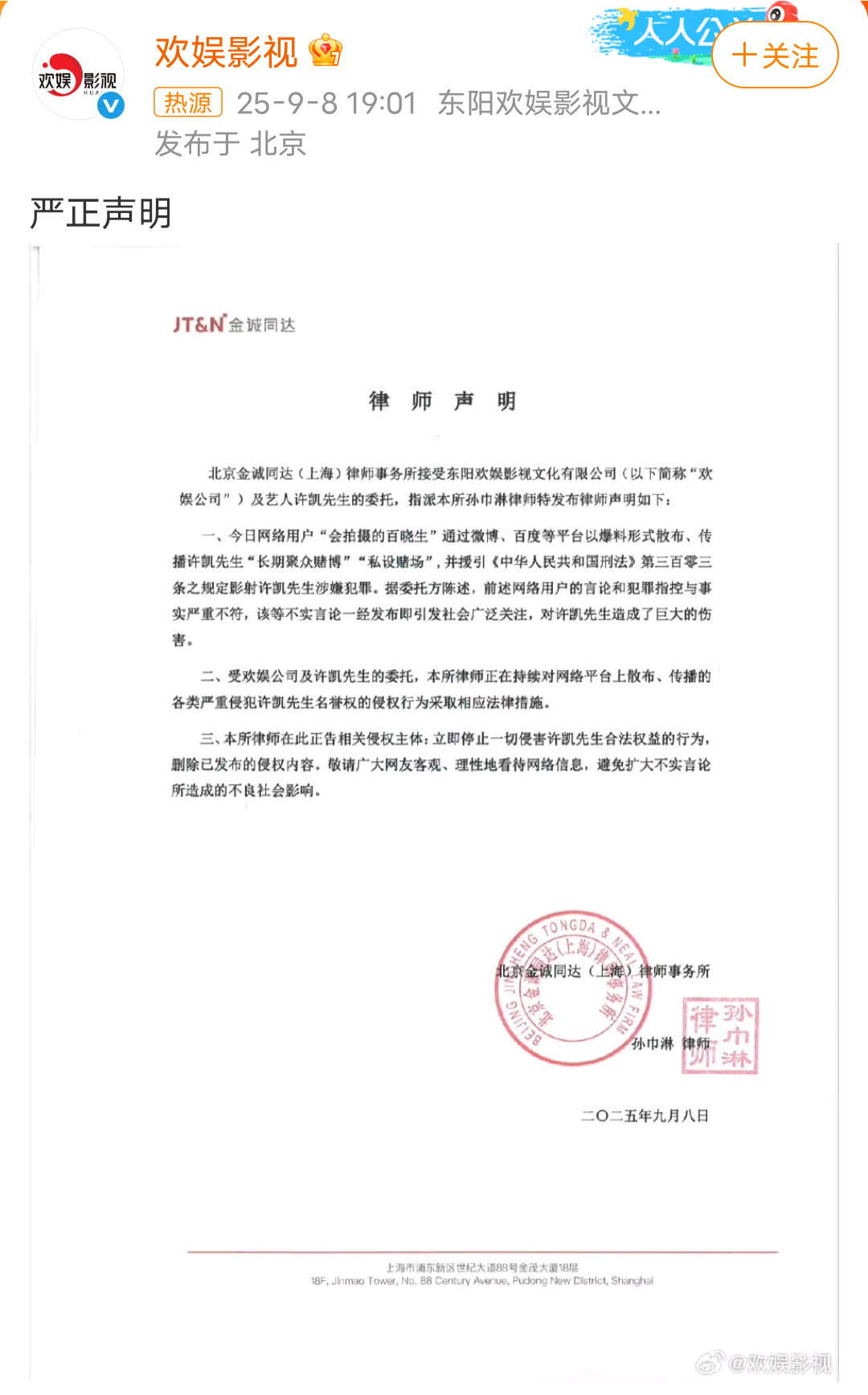 目前,东阳警方已通过官方渠道回应“已关注此事,正在核查相关情况”,许凯本人暂未回应,于正也未像往常一样“护犊子”,仅许凯所在娱乐公司欢娱影视发文律师声明称:指控与事实严重不符。
