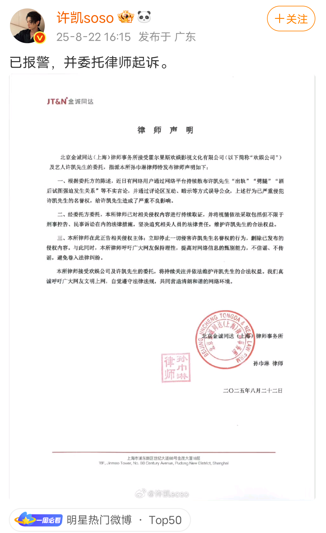 事件曝光后,许凯工作室2小时内发布声明,称“出轨传闻均为恶意捏造,已委托律师取证”。