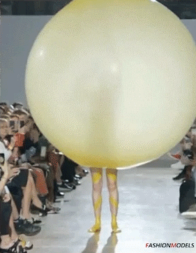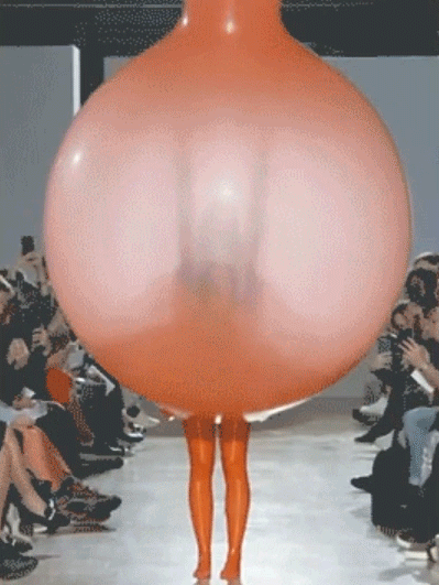 模特被罩在一个硕大的气球中,随后惊喜发生——模特以手动控制气球内部的简易阀口,让气球消气,贴合在身体上成为一套独特的服装。