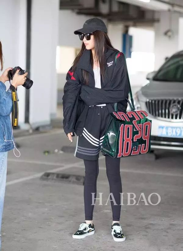 关晓彤身穿黑色条纹运动夹克,内搭白色T恤,肩背最近大火的Delvaux墨绿色字母印花透明手袋,下穿黑色条纹运动短裤,内搭黑色紧身Legging,脚踩Vans黑色卡通涂鸦系带休闲鞋,有些抓不住重点。