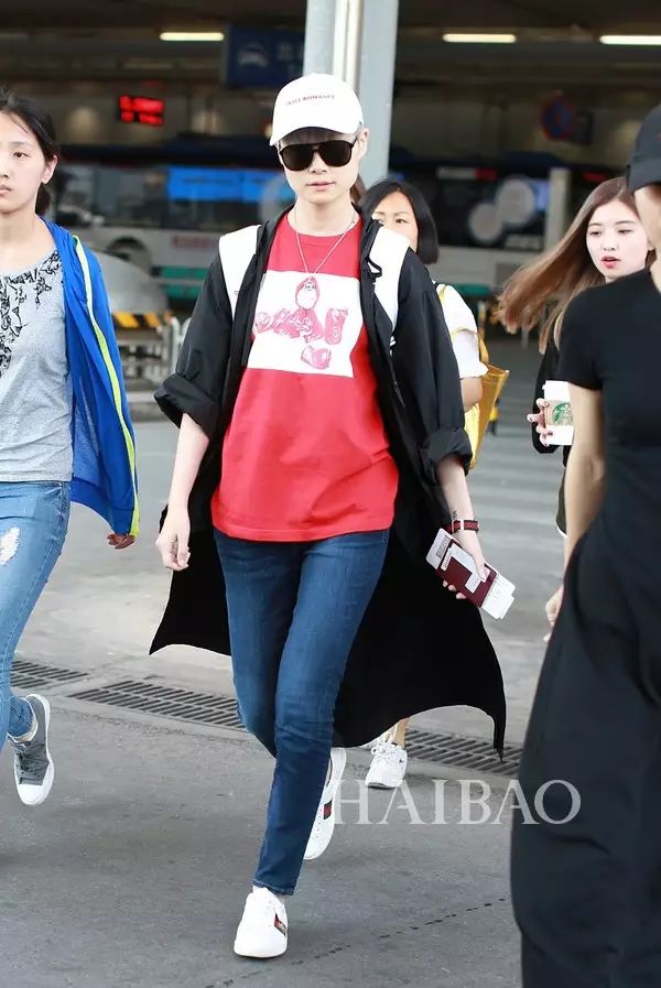 李宇春身穿黑色长外套,内搭可口可乐图案红T恤,下穿深色牛仔裤,脚踩Gucci小白鞋,一如既往随性的调调~
