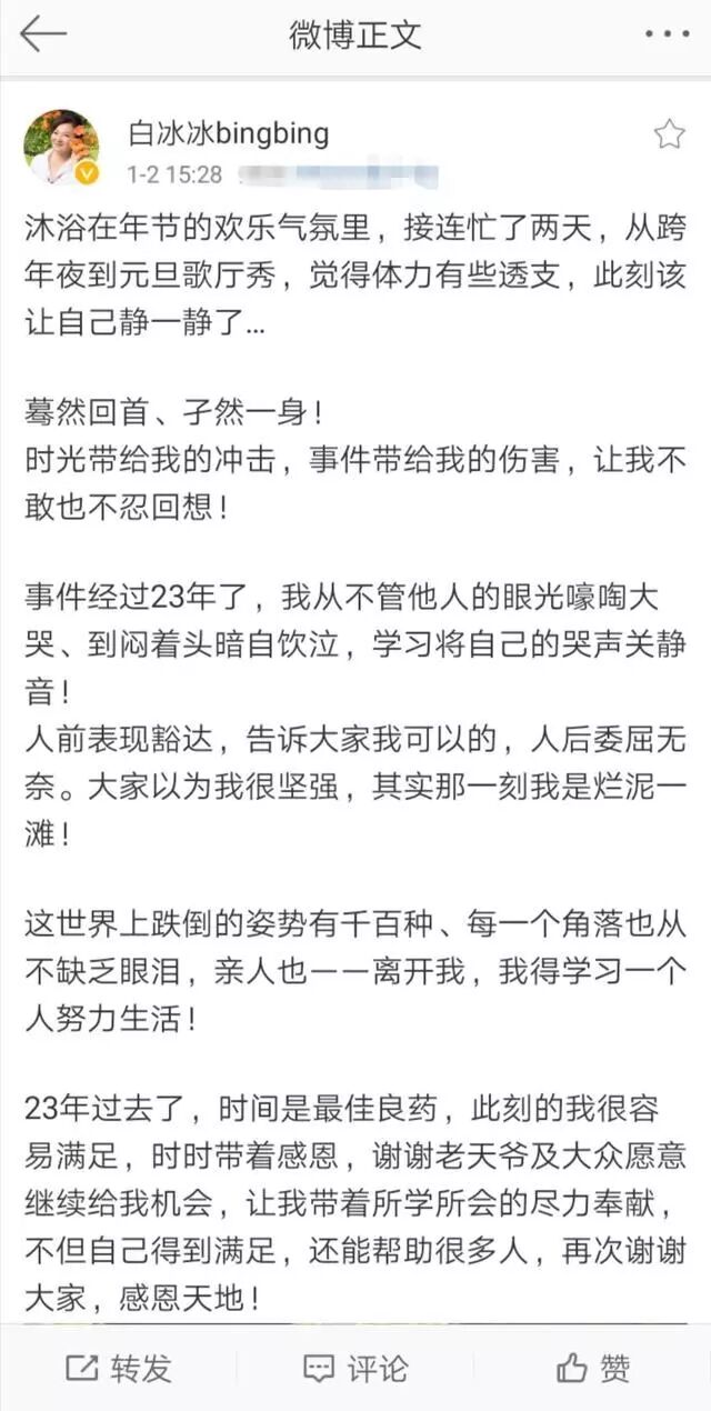 连着两天都在忙着参加跨年活动的台湾女星白冰冰,今天(1月2日)下午终于抽空在社交平台上发表了一番自己的新年感悟,“感恩天地”的同时,也承认了自己多年来的坚强外表其实是“假象”。