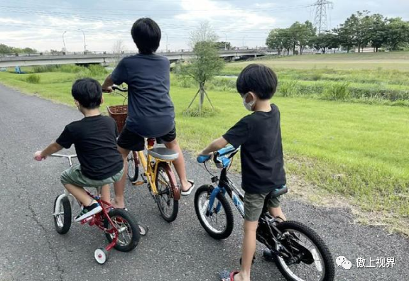 给妈妈过生日后,林志颖带着三个儿子在郊区骑自行车,kimi骑在前面,双胞胎哥哥在后面,林志颖在最后保护孩子们的安全,一个非常温馨的家庭。