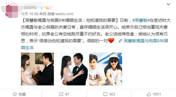 就像今天,周慧敏谈到了和倪震结婚八年,婚后生活很开心,因为倪震知道周慧敏需要什么。