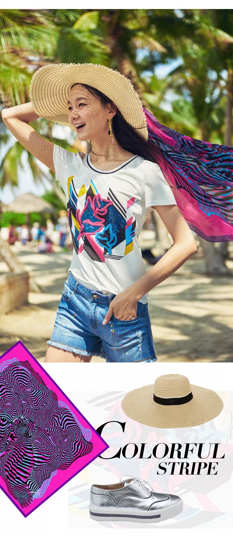 基础款的白T加上彩色条纹与花卉剪影的图案,瞬间就变得与众不同了。清凉的短打造型最适合在海滩边踏浪。一条玫红色系丝巾,与T恤印花相呼应,用来遮挡了阳光,或系于腰间、手腕,无论是特写还是远景,怎么拍都好看。又瘦又美,还有什么理由不带着它一起去海边呢?
