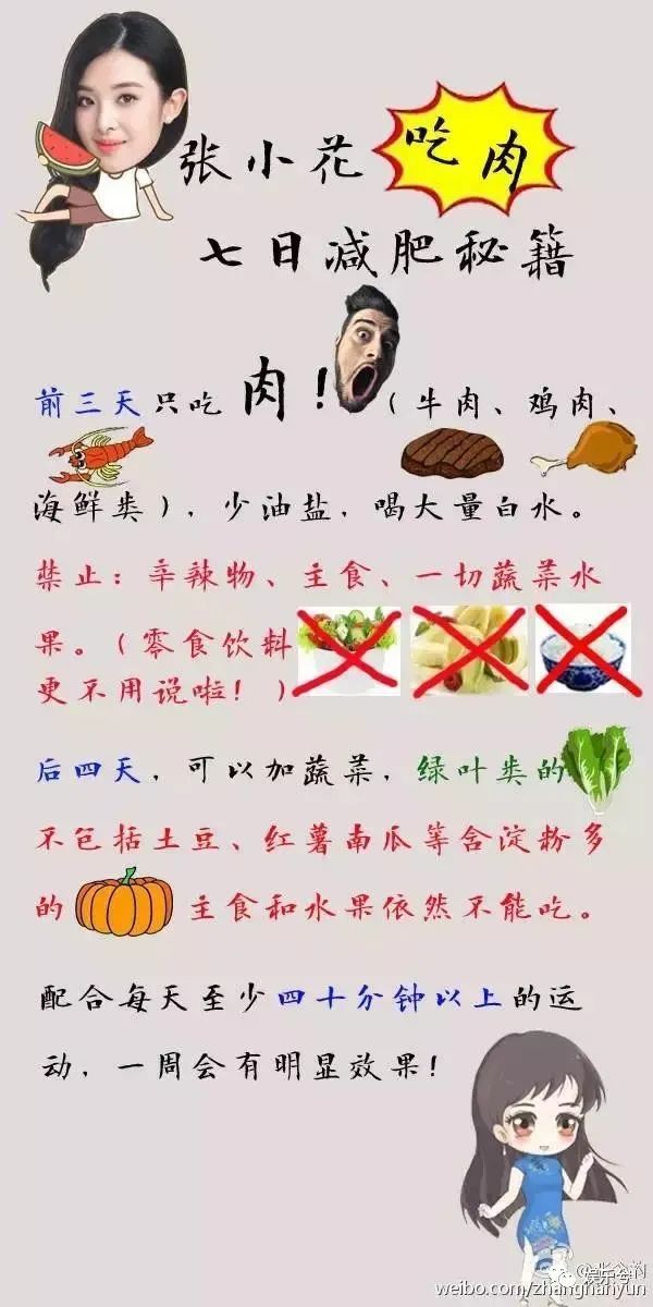 之前,张小花曾经公布过一次只的“张小花吃肉七日减肥秘籍”: