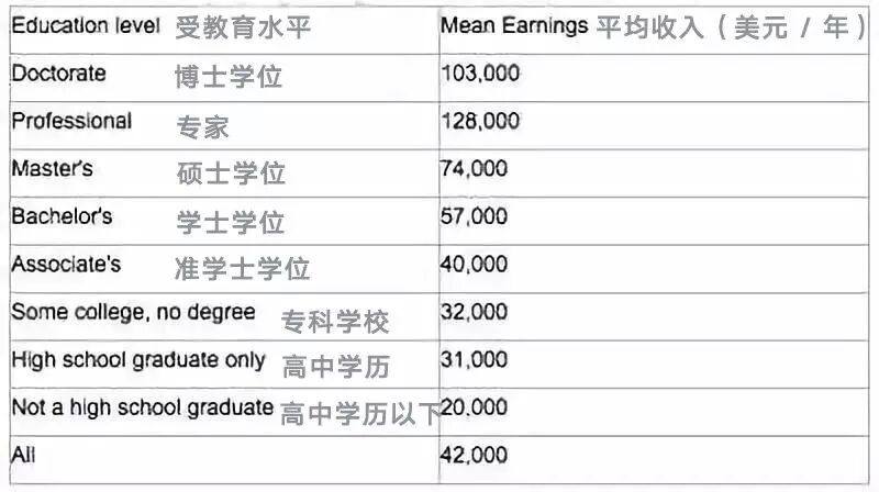 上图是美国社会收入和最高学历的关系图。