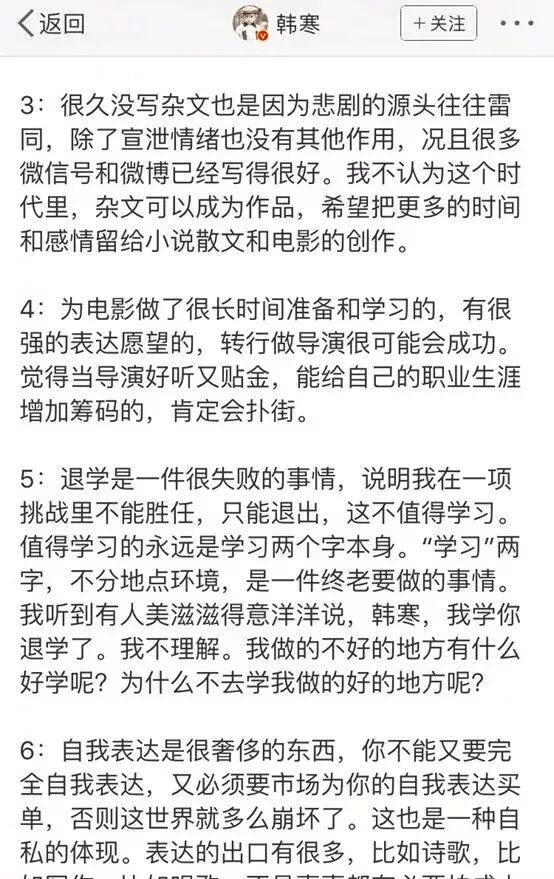 一直说着“七门功课红灯,照亮我前程”、“到现在都一直在庆幸自己没去上大学”、“高考作文很蠢”的韩寒,后来也对自己的过往做了反思。