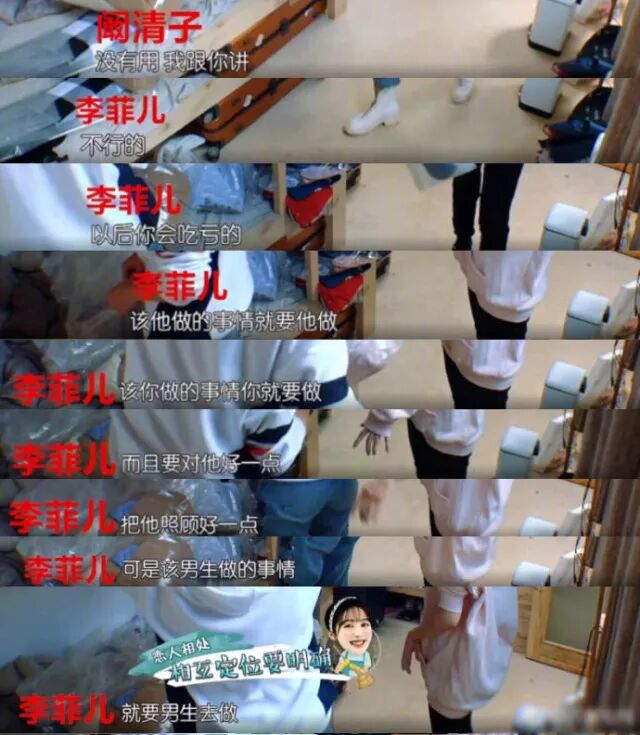李菲儿坚决要求男生去做,并告诉阚清子:你可以多照顾男友,但是该男生做的事情就要男生做。女生如果什么事情都扛着,男生会习以为常,就不珍惜你了,我以前吃过这样的亏。